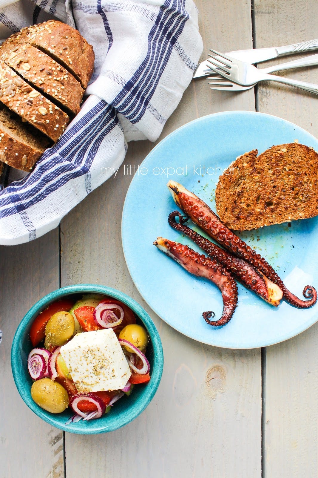 The octopus, cooked this way, is soft and juicy on the inside and beautifully charred, crusty and almost caramelized on the outside, just like it should be. It is the perfect mezes to have with a horiatiki salad, lots of grilled bread, some potato fries and other seafood, and of course with a glass of wine or ouzo.