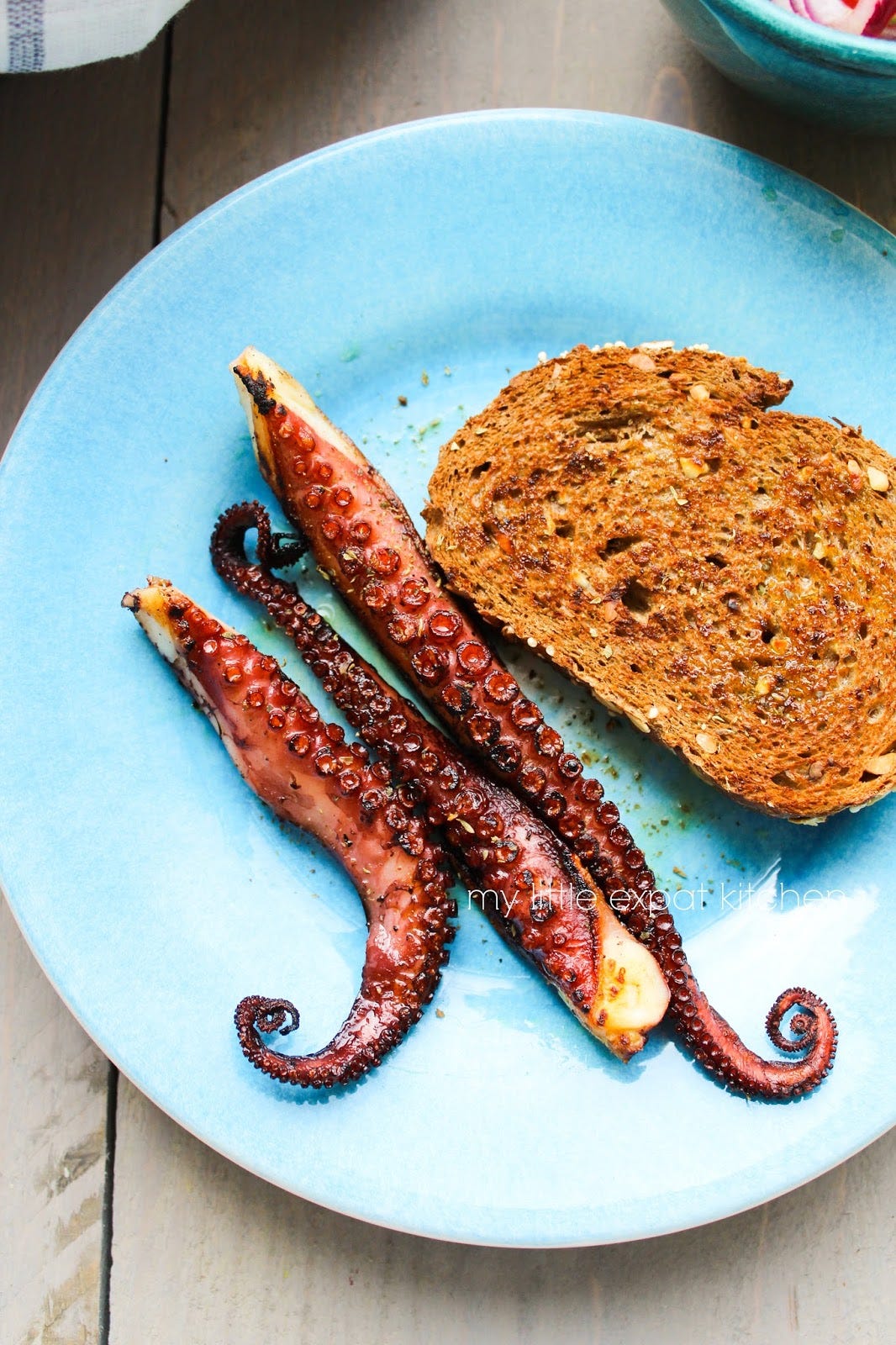 I have shared with you a couple of octopus recipes in the past, both Greek; one for braised octopus with pasta, and another for boiled octopus with vinegar, olive oil and oregano, and this one is yet another amazing octopus preparation; the grilled octopus. I usually grill it (essentially griddle it), but you can use an open grill/bbq as well.