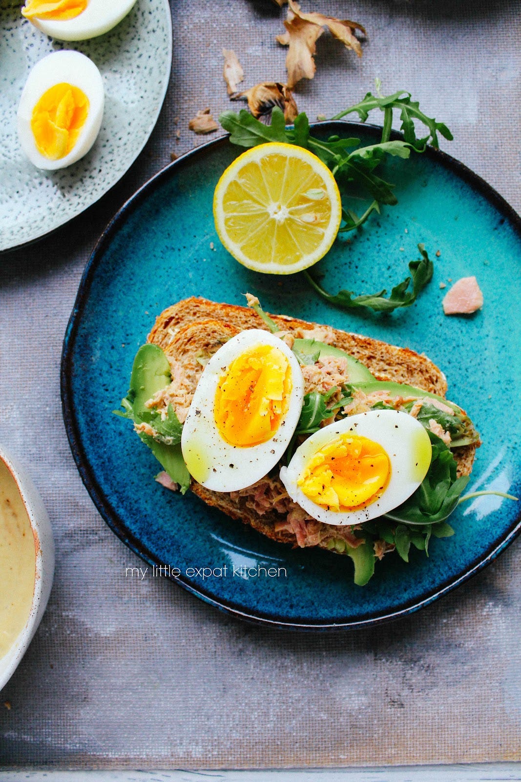 Tuna, egg and avocado sandwich with a tahini, miso and black garlic sauce