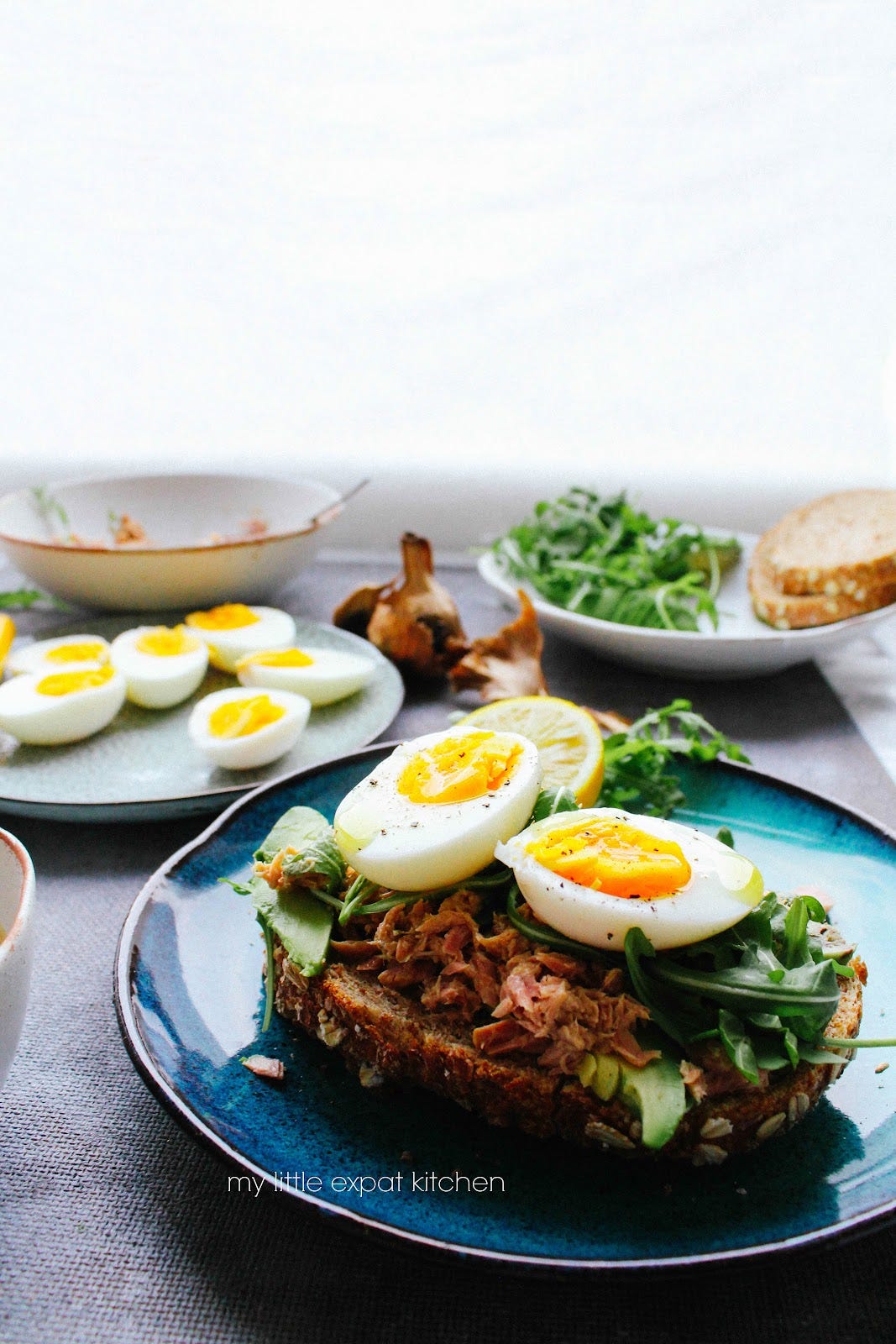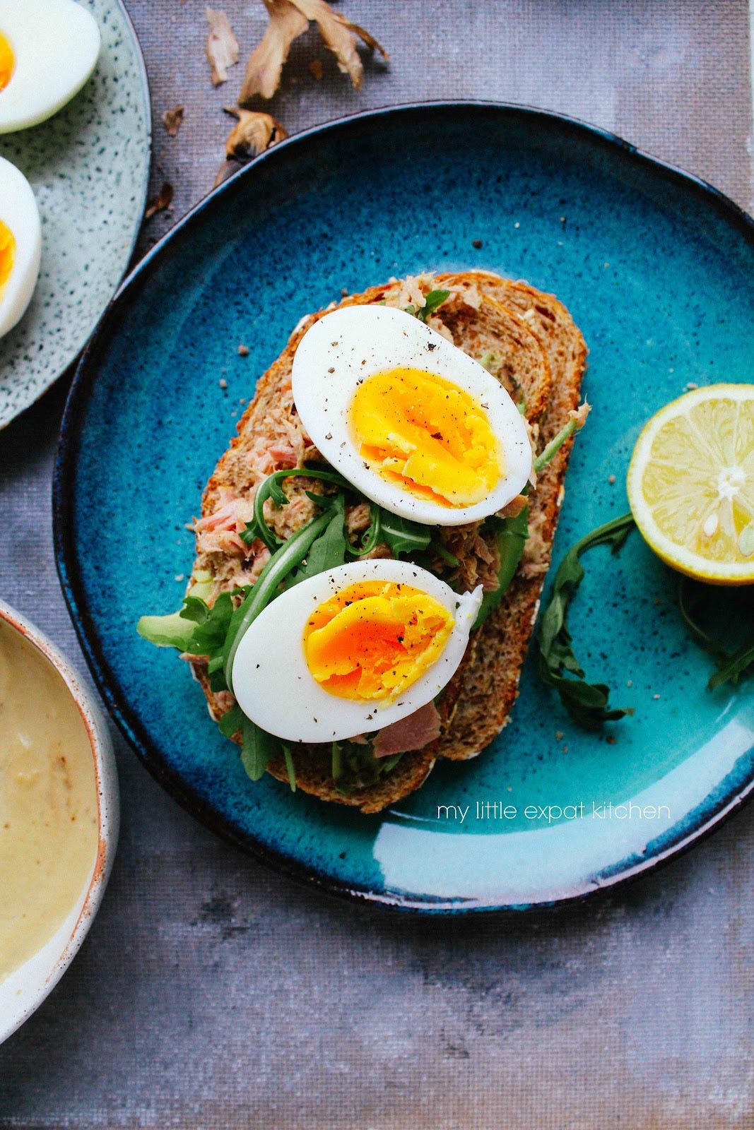 Tuna and egg sandwich with avocado and a tahini, miso and black garlic sauce
