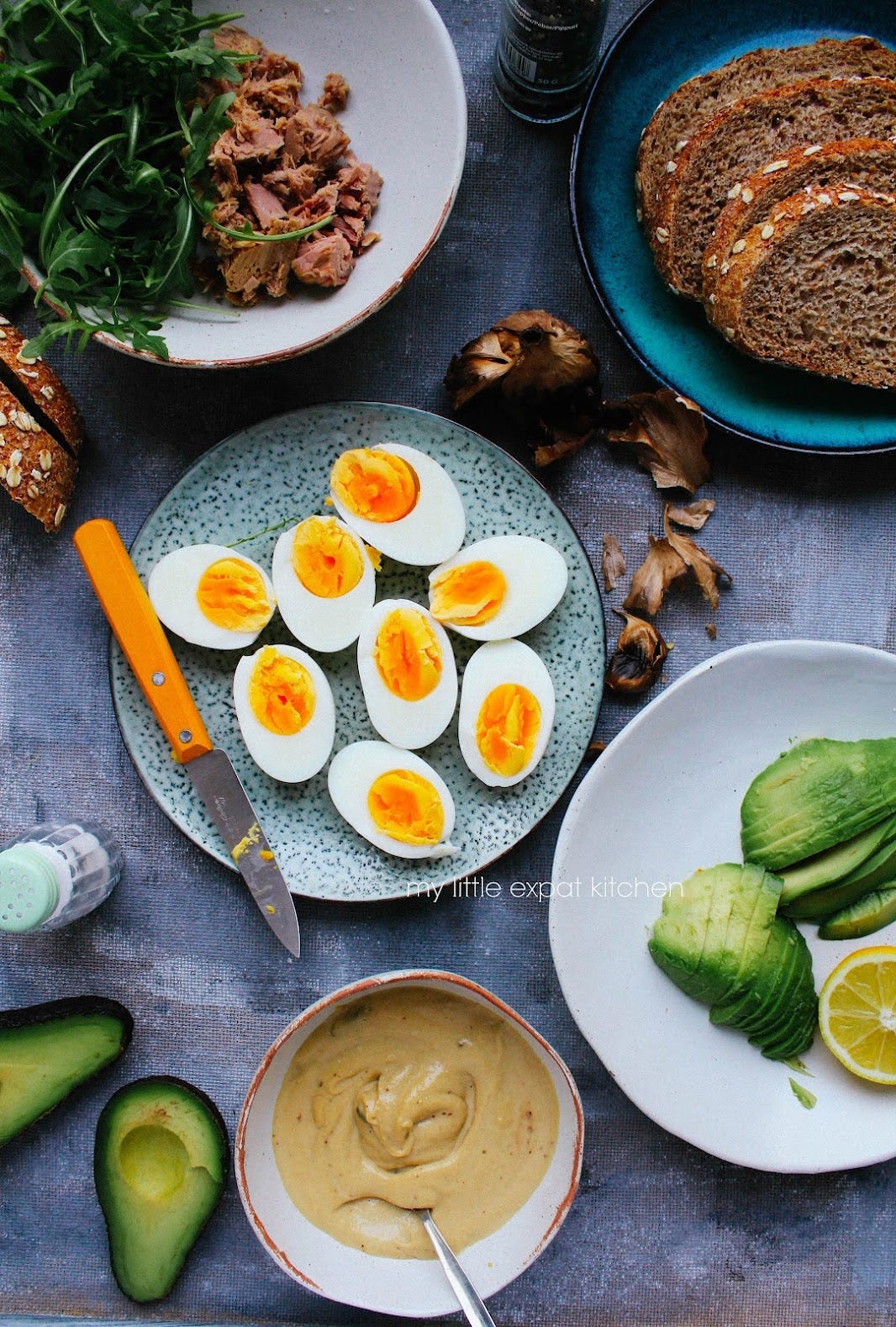 In this sandwich, we have tuna, rocket, boiled eggs and sliced avocado on good sourdough, multigrain bread, with the most delectable, full of umami, earthy sauce. Rich and creamy, with salty miso and buttery tahini, with the caramel-y, balsamic flavor of black garlic, the freshness and acidity of the lemon and the fruitiness of the extra virgin olive oil, it is such a perfect combo.